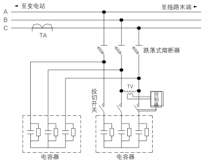 TBBZ系列高壓線路無功補(bǔ)償裝置主要由控制器,真空接觸器,電容器,電壓互感器,綜合保護(hù)器等組成。系統(tǒng)通過線路開啟式電流互感器采集線路電流信號(hào),分析判斷線路無功功率缺失容量,控制電容器組的投切,使功率因數(shù)達(dá)到設(shè)定目標(biāo)值。裝置采用戶外跌落式熔斷器對(duì)進(jìn)行短路保護(hù),一旦裝置有短路故障,跌落式熔斷器立即跳開,防止對(duì)裝置和線路造成損害。