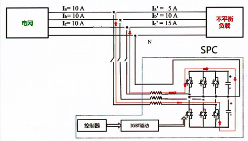 DESPC裝置開啟后,通過外接電流互感器(CT)實時檢測系統(tǒng)電流,并將系統(tǒng)電流信息發(fā)送給內部控制器進行處理分析,以判斷系統(tǒng)是否處于不平衡狀態(tài),同時計算出達到平衡狀態(tài)時各相所需轉換的電流值,然后將信號發(fā)送給內部IGBT并驅動其動作,將不平衡電流從電流大的相轉移到電流小的相,最后達到三相平衡狀態(tài)。